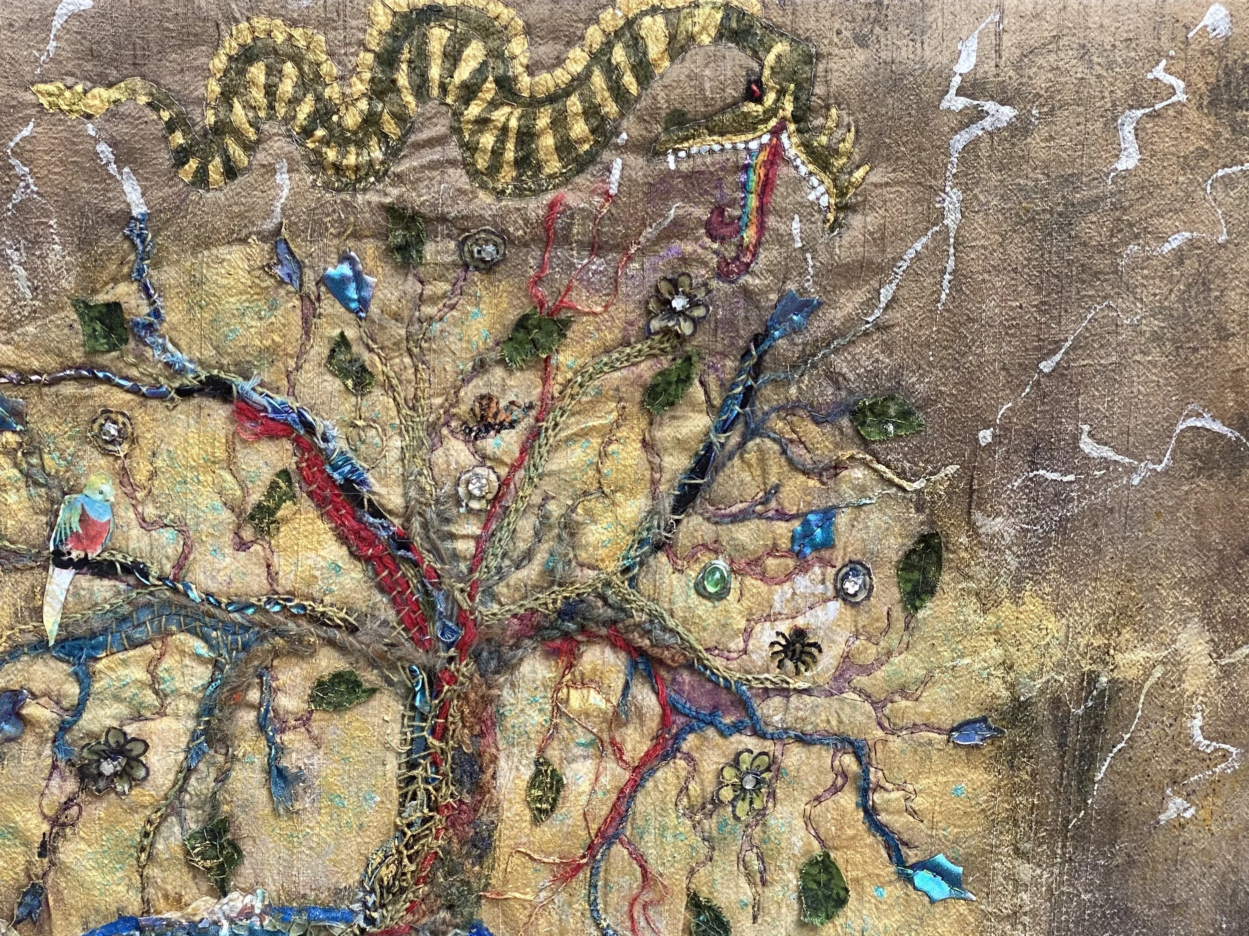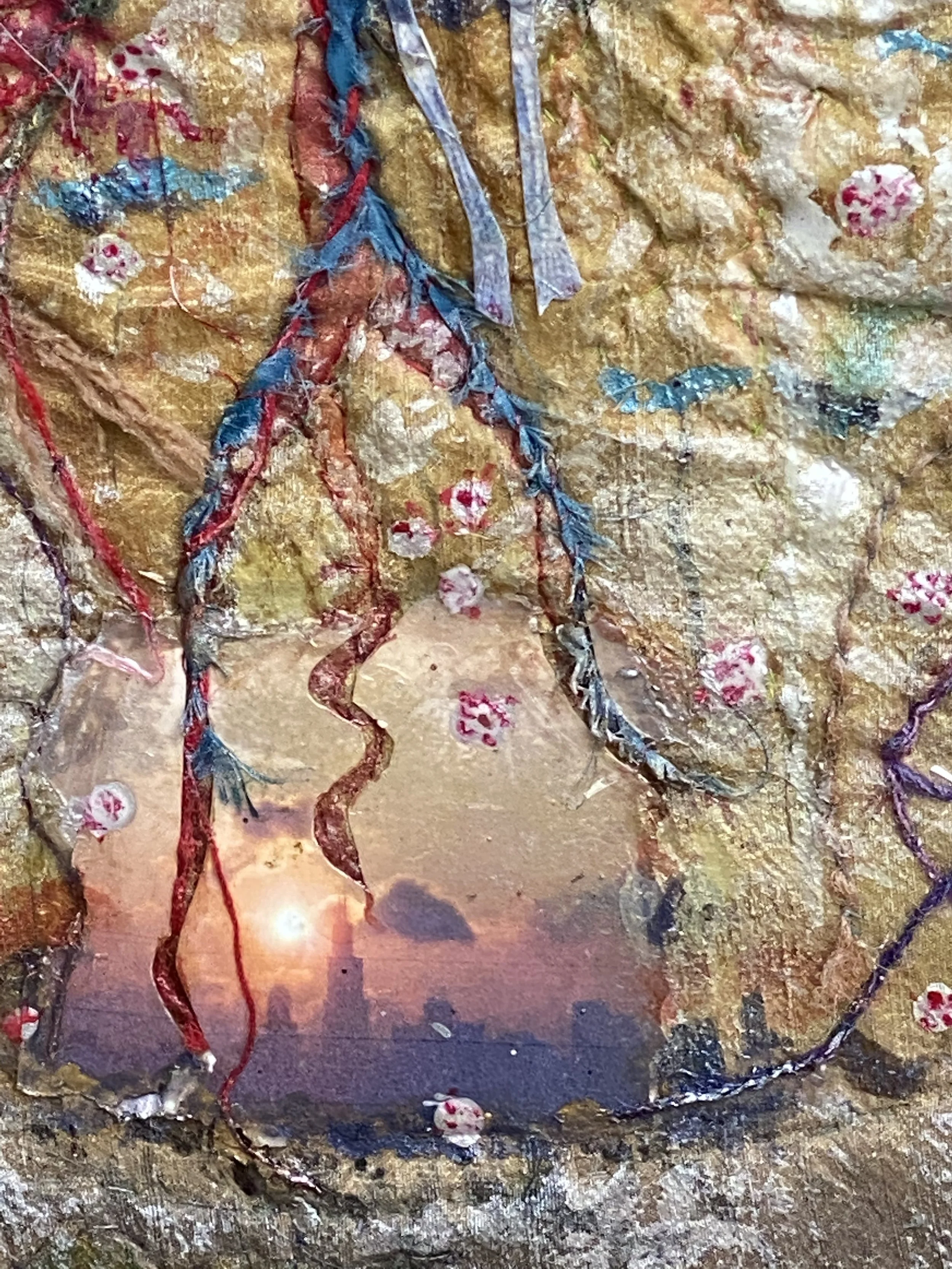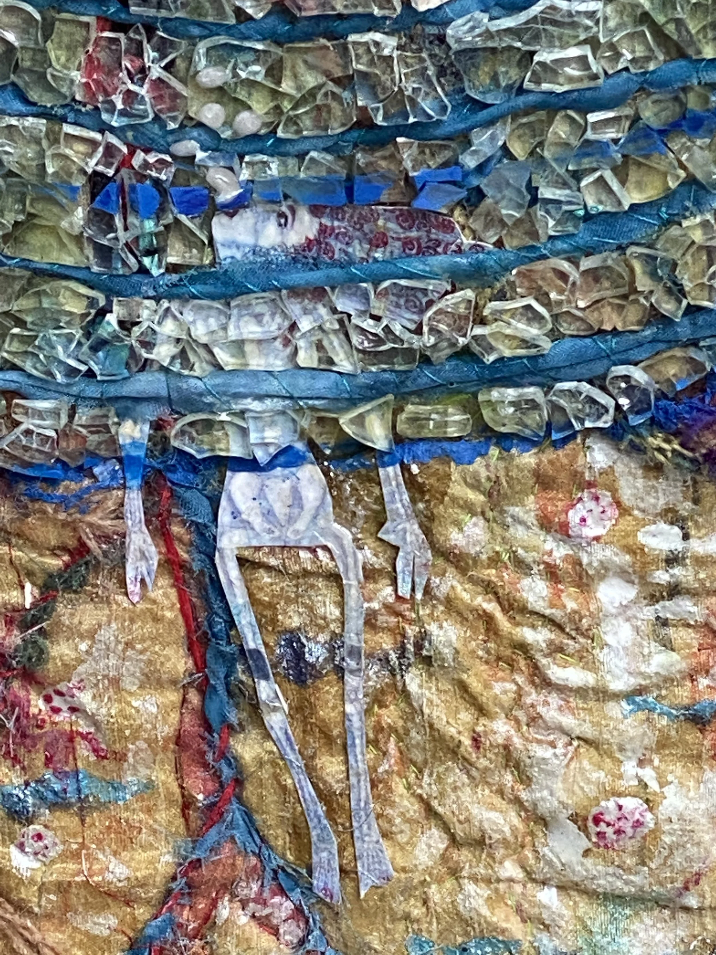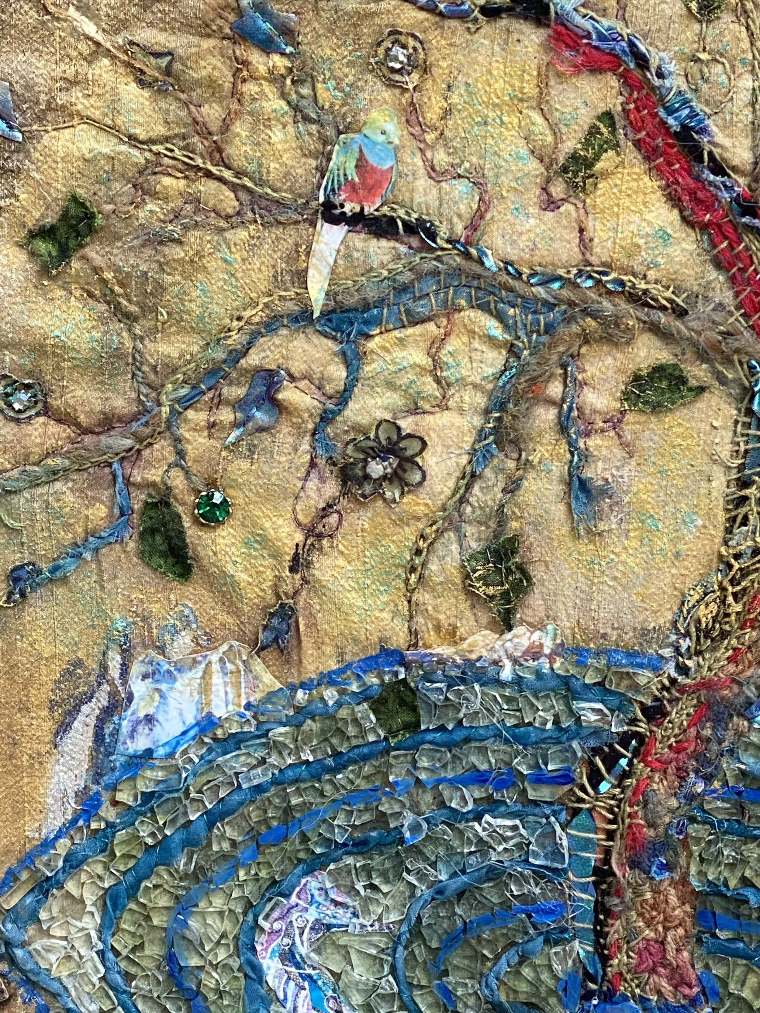 Nine Waves OutBy Karen SchumanFabric, Dye, Acrylic, Fabric Applique’, Quilting, Decoupage30”x24”$850I have the wish that my art pieces depict a portal; some aspect that is meant to show an opening to another place/dimension. Using geometry from the Flower of Life philosophy,